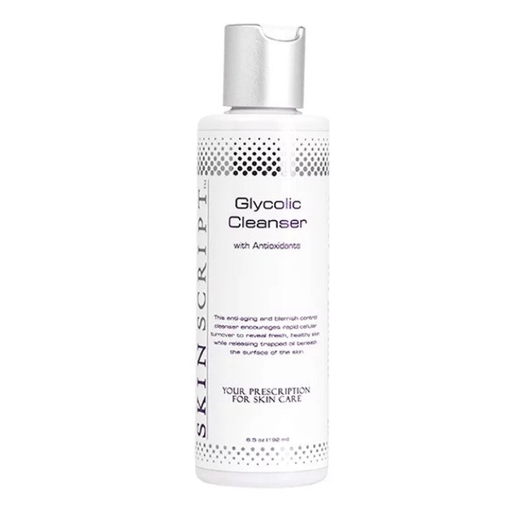 Skin Script Glycolic Cleanser with 17% glycolic acid — deeply resurfaces skin to refine pores, balance oil, and brighten acne scars. For oily and acne-prone skin types; supports cellular turnover and helps reduce fine lines over time.