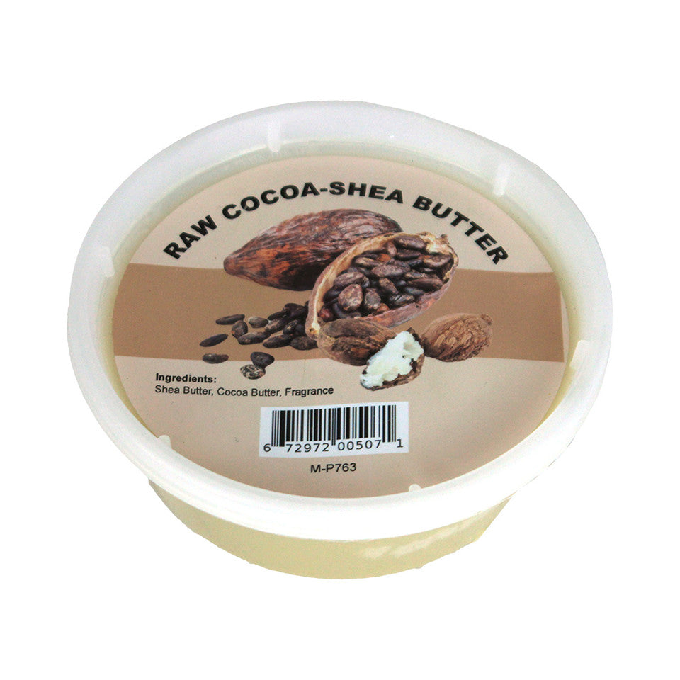 This Raw Cocoa-Shea Butter combines two of the most potent and valuable skin care ingredients out there. Cocoa Butter is your secret weapon in the battle for beautiful, healthy skin. Cocoa butter is known around the world for being one of the most valuable skin care ingredients around. Cocoa butter is a yellowish fatty acid that is extracted directly from the cocoa beans. It contains natural antioxidants that combats acne and other blemishes to give you clearer and smoother skin. It is most commonly used for dry skin and the treatment of stretch marks during and after pregnancy. It has a natural source of vitamin E. It is also an excellent treatment for chapped hands, lips, stretch marks and skin irritation. It is commonly grown in Ghana, from the Theobroma cacao tree.